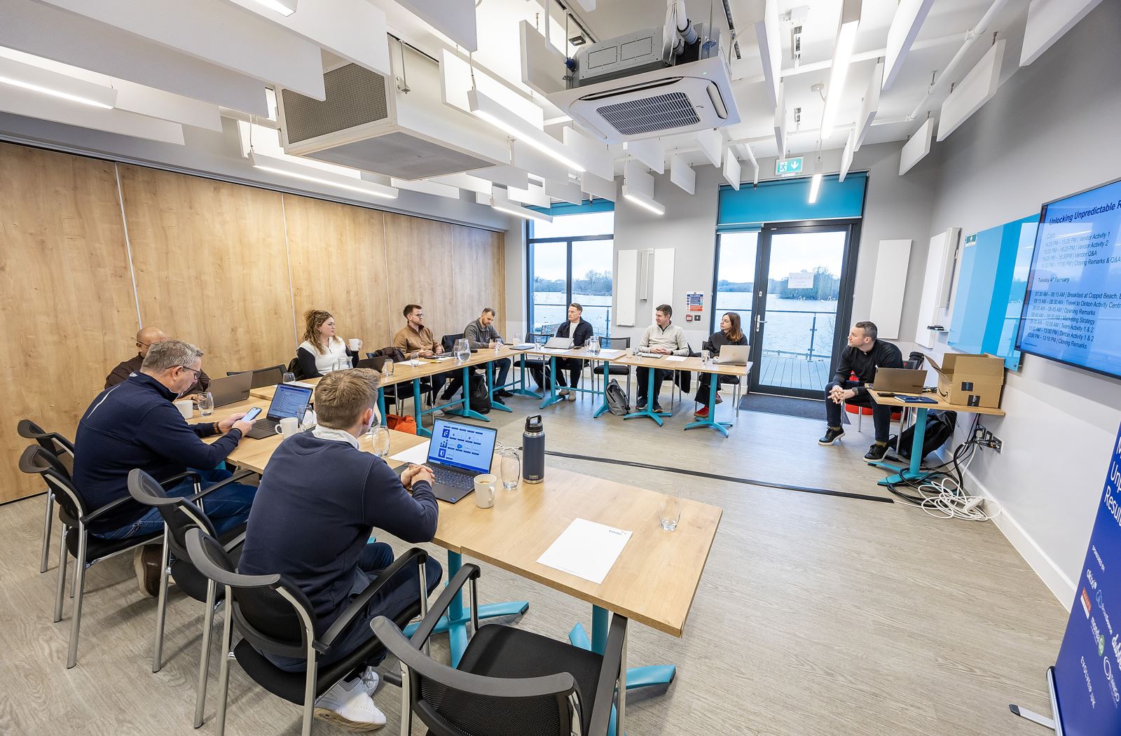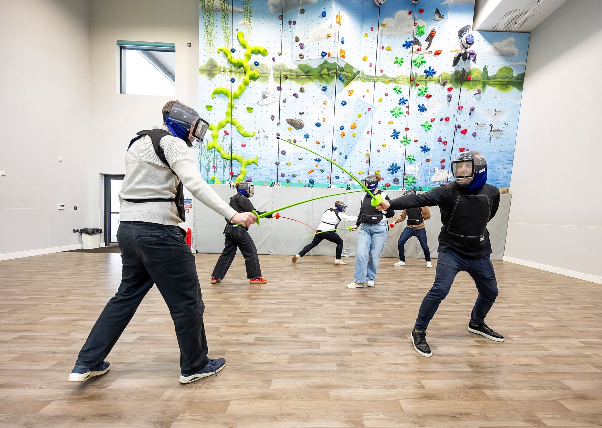 Spaces used: The Classroom, meeting room within Dinton Activity Centre. Then outside climbing wall with the fencing taking place in our Activity Hall which doubles up as an internal climbing wall and wet weather back up for groups when required. The Classroom is a versatile room overlooking Black Swan Lake, providing groups with a perfect backdrop and breakout space for refreshments and time out. Head off around the lake for “netwalking” and boost creativity by 60% getting your teams outdoors!